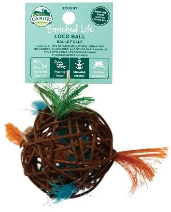 Balle fait de vigne naturel, Oxbow a pensé à votre petit poilu à quatre pattes! Cachez des petites gâteries ou sa nourriture dans la balle et votre petit ami dépensera son énergie à mâcher et chercher à travers les petites touffes de fibres colorés.