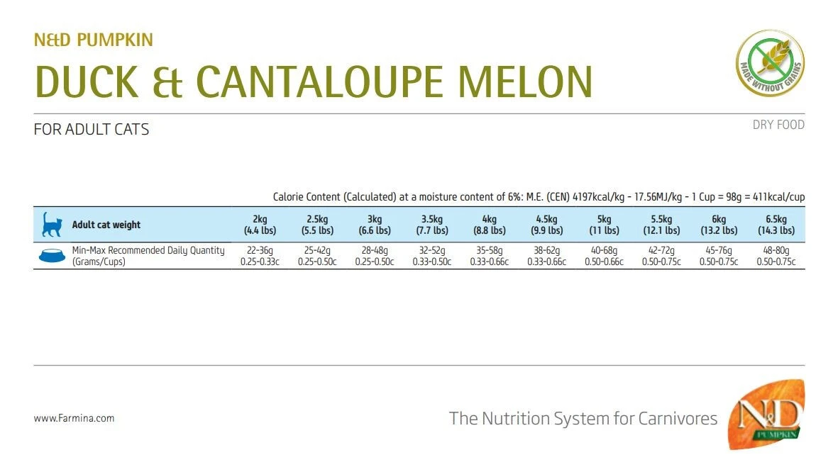 La nourriture N&D Potiron au Canard et Cantaloup pour chats adultes Farmina est composée de viande fraîche de canard, de potiron et de cantaloup. Cette recette, formulée par des vétérinaires en Europe, repose sur plus de 50 ans d’innovation en matière de nutrition animale. Elle ne contient pas de céréales, de sucre, de sous-produits, de colorants, d’OGM ni d’agents de conservation artificiels. Pour assurer la fraicheur et la qualité du produit, de l’azote est introduite dans le sac lors de l’emballage. Cette dernière se substitue à l’oxygène, garantissant une conservation naturelle de la nourriture. Un autre procédé technologique est utilisé pour garantir la valeur nutritionnelle des croquettes, . Il s’agit de l’injection à froid des précieux nutriments et de l’enrobage sous-vide, par exemple de la taurine est ajoutée pour s’assurer que le chat reçoit tout ce dont il a besoin. La nourriture N&D Potiron au Canard et Cantaloup contient 44% de protéines et elle est parfaite pour les chats sensibles.