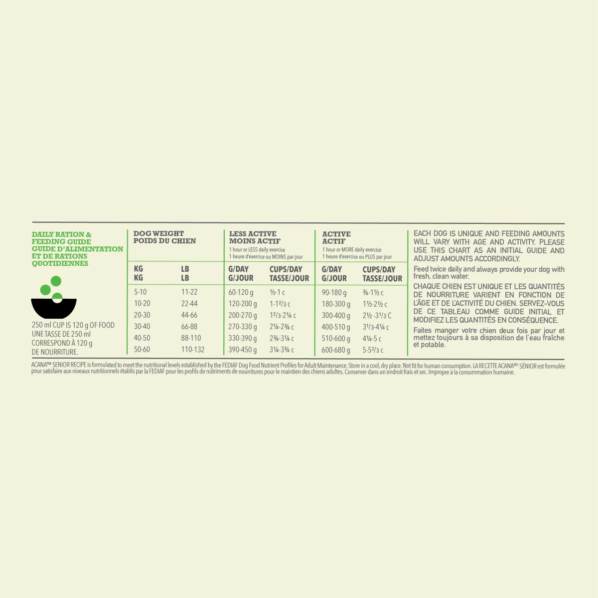 La nourriture ACANA recette sénior est une nourriture qui convient à un chien vieillissant ou un chien moins actif. Riche en protéine, elle est composée de poulet élevé en liberté et d’ingrédients régionaux frais. Elle gardera la peau et le pelage de votre animal en santé grâce à ses omégas. L’ACANA recette sénior est sans grains et est un produit canadien parfaitement adapté pour les chiens âgés.